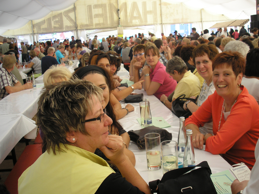 Mittags war das Ziel „das größte Weinfest der Welt“ erreicht. Grüppchenweise strömten die Damen in alle Himmelsrichtungen um die schöne kleine gemütliche Altstadt von Bad Dürkheim, den Rummel als auch den Krammarkt unsicher zu machen. Bei strahlendem Sonnenschein genoss man gerne ein Eis oder Kaffee und Kuchen in den vielen schönen kleinen Cafes der Stadt. Nach einem abwechslungsreichen Nachmittag mit Riesenradfahrt und Wildwasserbahn fanden sich dann um 17:00 Uhr alle nach und nach im Weinzelt „Hamel“ zum feiern ein. Bei live